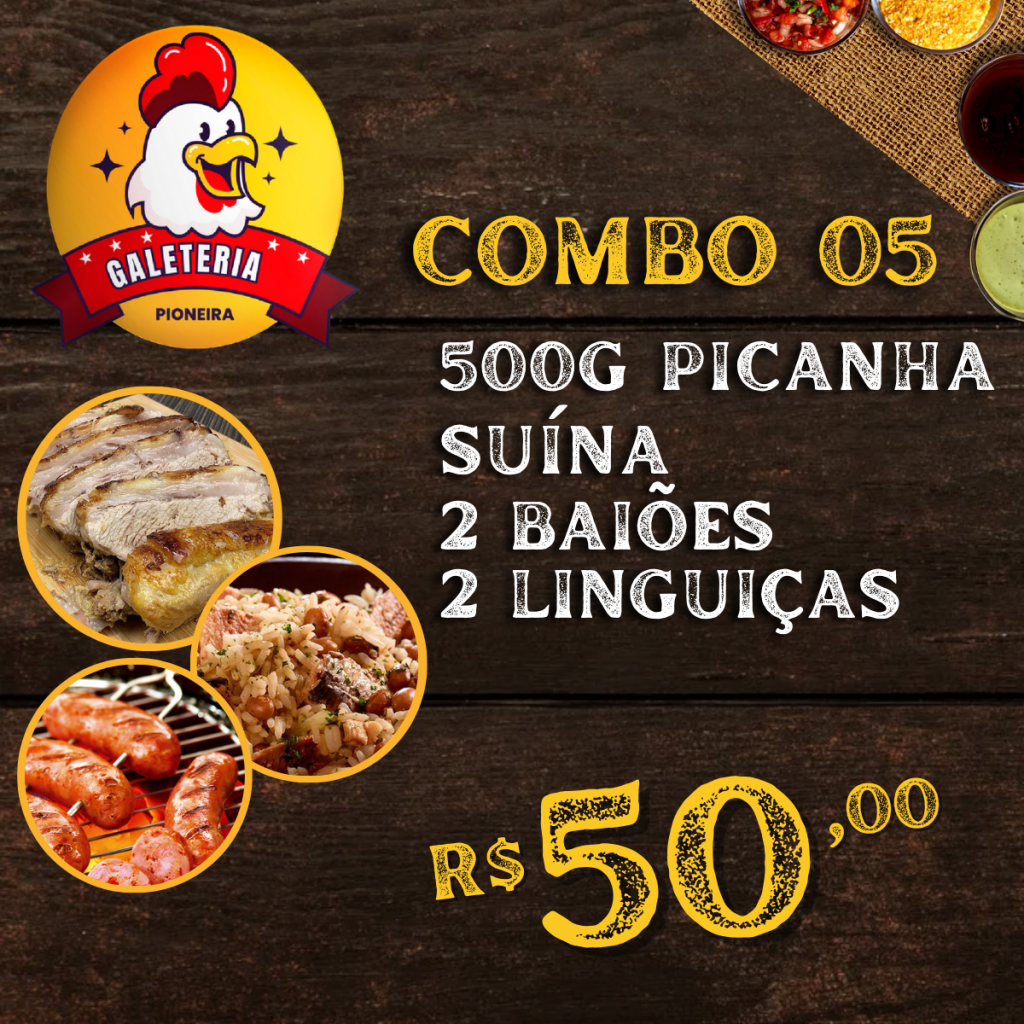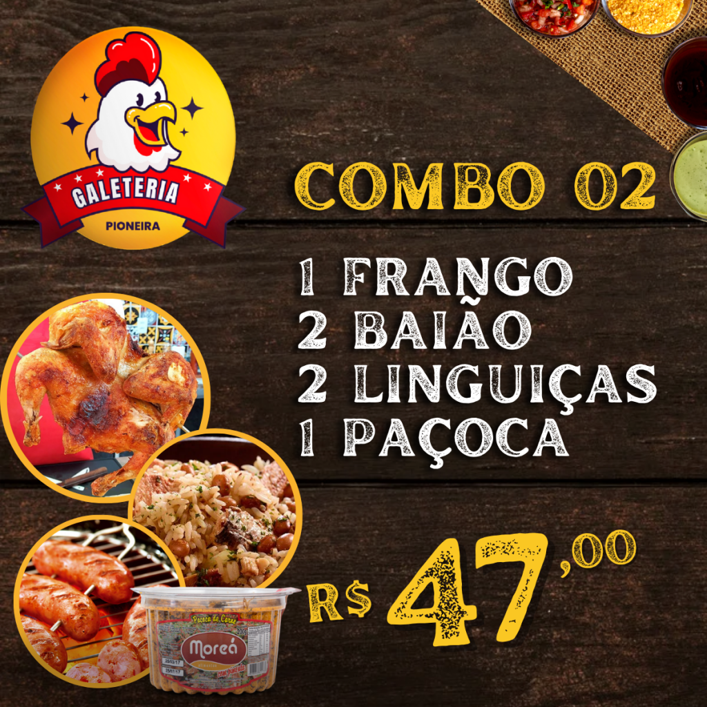 ![]() Combo 021 Frango, 2 baião, 1 Paçoca, 2 Linguiças. R$ 50,00 |