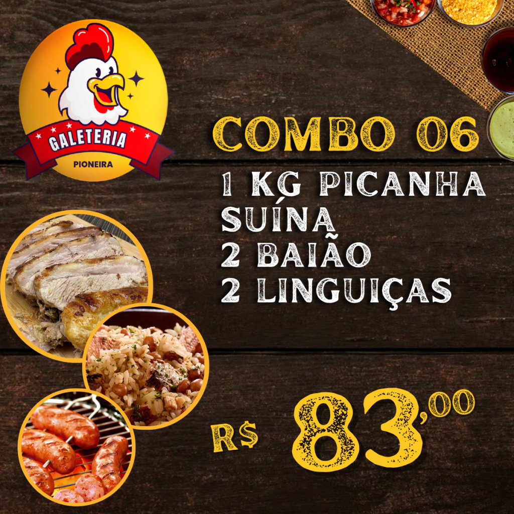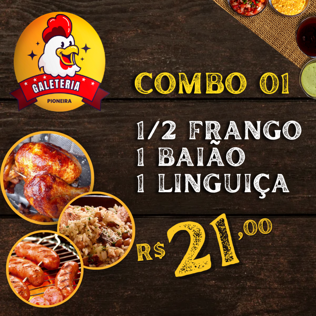 ![]() Combo 011/2 Frango Assado, 1 Baião e 1 Linguiça. R$ 22,00 |