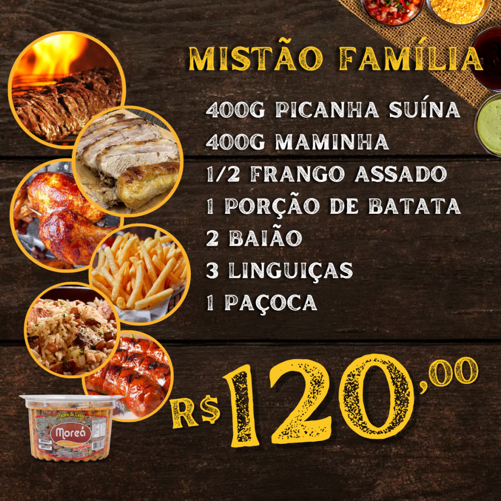 ![]() Mistão Família400g Picanha Suína 400g Maminha 1/2 Frango Assado 1 Batata Frita 3 Linguiças 2 Baiões 1 Paçoca R$ 120,00 |
