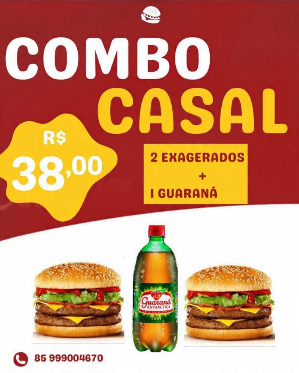 ![]() COMBO CASAL2 Sanduiches Exagerado ( Pão bola, 2 carnes de hambúrguer, 2 queijos , presunto, tomate e alface ) + 1 Guaraná de um Litro. R$ 38,00 |