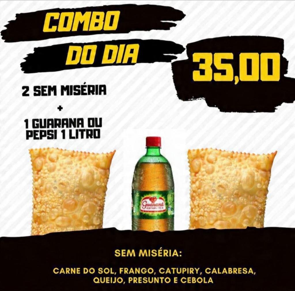 ![]() COMBO SEM MISÉRIA2 Pasteis sem miséria ( Frango, carne do sol, calabresa, queijo, presunto, catupiry e cebola ) + 1 Guaraná de um Litro. R$ 35,00 |